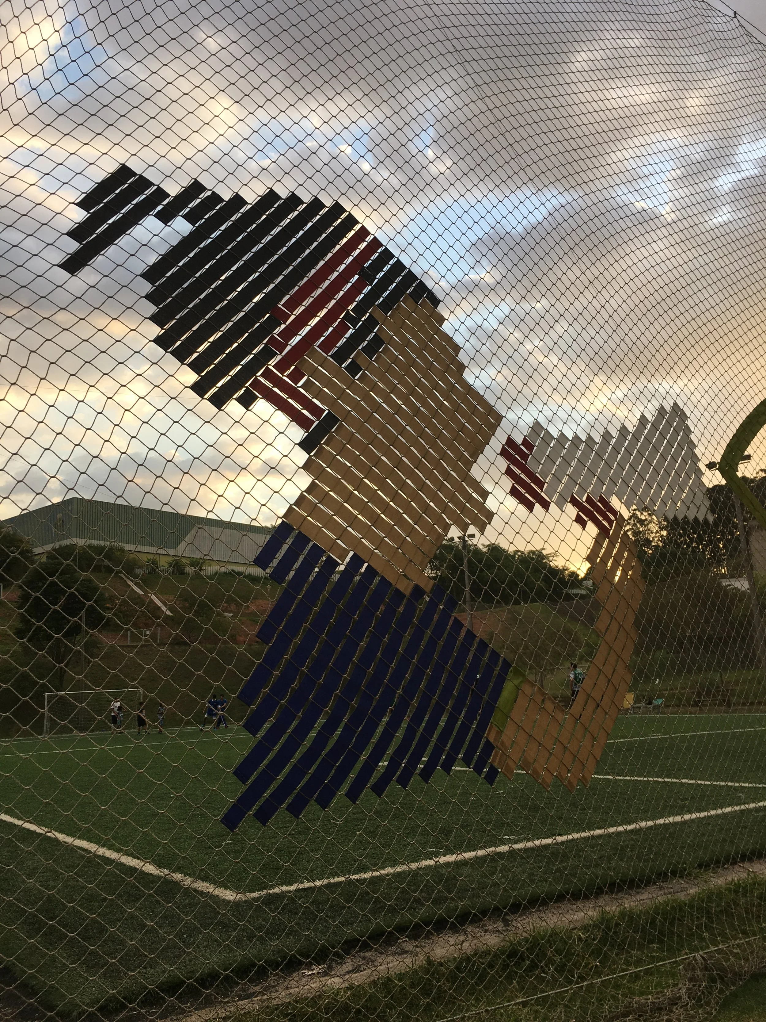Coletivo formado por mulheres que trabalha com técnicas têxteis em escalas urbana. Nessa ação, realizada nas redes da quadra de futebol de campo do SESC Osasco, elas bordaram palavras escolhidas pelas meninas que fazem parte do time de futebol que treina na unidade, as ‘Meninas no drible’.