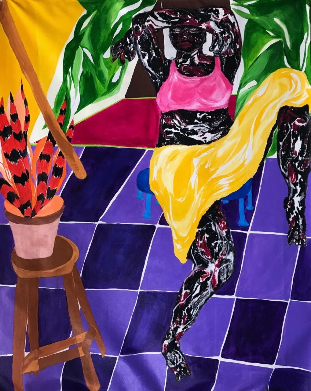 Para produzir eu gosto de colocar uma playlist de músicas (que não dão vontade de dançar) e às vezes também fico pensando em questões atuais. Muitas vezes, os títulos vêm quando eu estou pintando, vêm também algumas formulações de frases. Gosto de pensar em mulheres e em movimentos que eu fiz no dia para colocar na tela.