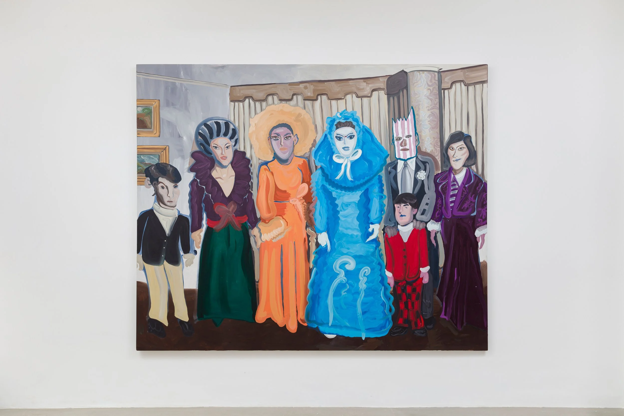 Por questões de proximidades estéticas e interesses visuais, como as pesquisas sobre o gênero retrato na contemporaneidade e sobre o interior doméstico, os aspectos decorativos e as suas possíveis leituras no âmbito da Arte, próximos aos das minhas pesquisas artísticas, me apropriei deste retrato e “adotei” esta família como minha, para esta exposição. Eu desenvolvi uma pintura dela, por meio de recursos pictóricos como, a criação de novas visualidades, através de adereços, de distorções, de paleta de cor, de dimensões, de proporções etc. E, quase como forma de “matar a minha própria curiosidade”, utilizando de algum conhecimento espacial adquirido na faculdade de Arquitetura, de aspectos decorativos da tradição francesa, como a “Chinoiserie”, as tapeçarias Gobelin, o abajur estilo Luiz XV, as pratarias tipicamente francesas, os tecidos ornamentados trazidos para o Brasil, por meio da colonização europeia e ainda encontrados no país (mesmo que, muitas vezes, ultra modificados pela reprodução e pelas releituras) e, também, investigados durante a residência artística, em Paris.