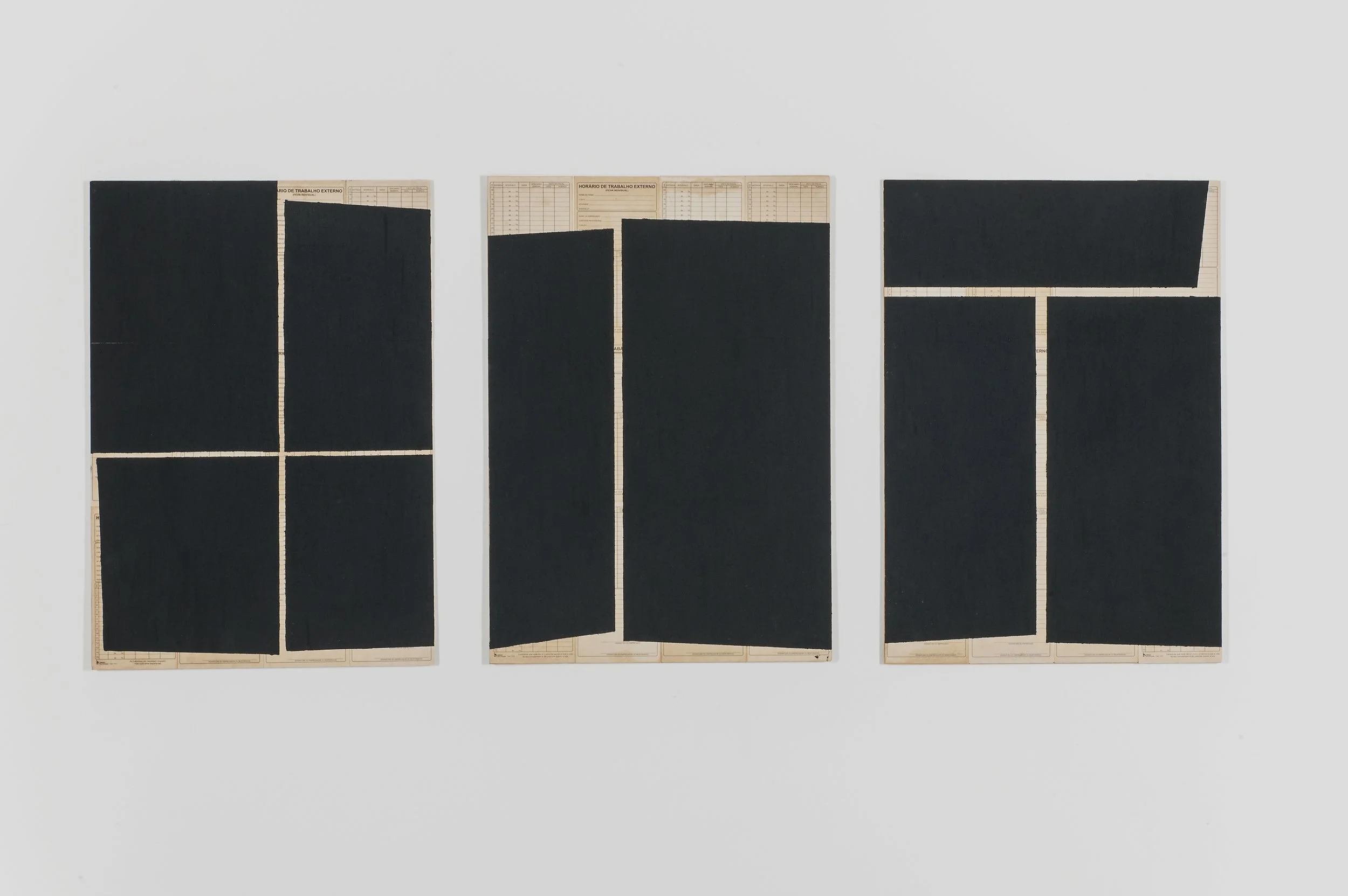 Em As Horas, cartões de ponto envelhecidos são dispostos lado a lado formando um plano sobre o qual são pintadas áreas geométricas feiras com tinta a base de carvão. As densas áreas recobrem grande parte da superfície de cartões, deixando apenas algumas frestas, através das quais podem se ver datas, horários e atividades que compõem uma rotina de trabalho. Os planos evocam a rotina pesada e estafante e também trazem um sentido de esquecimento do que se é realizado de maneira mecânica e repetitiva todos os dias, onde o tempo é pesado e engolido na escuridão.