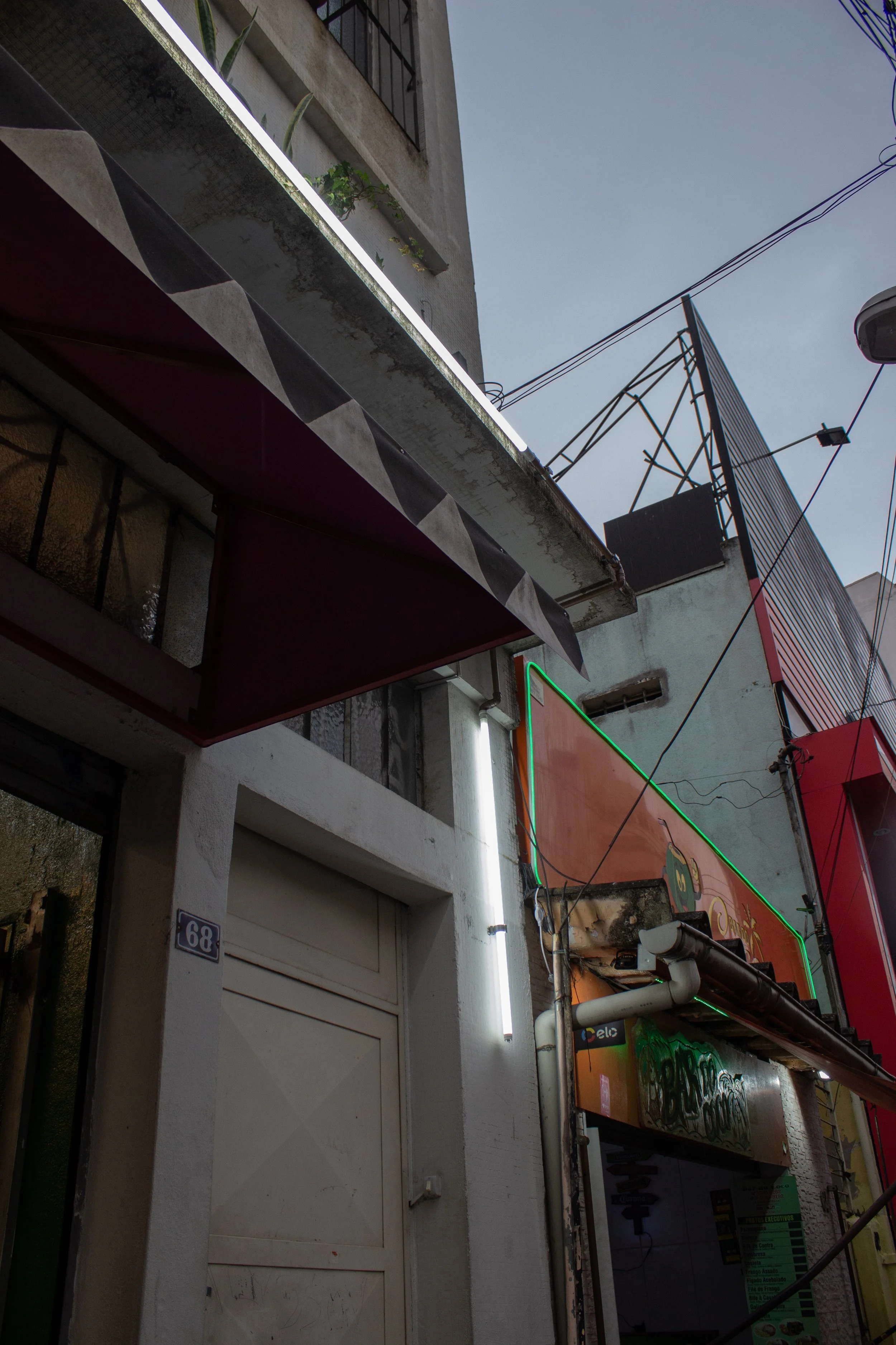 Sistemas lineares feitos de tubos de PVC e lâmpadas led tubulares são instalados em diversos lugares da cidade. Como organismos vivos que se apropriam de elementos comuns daquela paisagem, criam circuitos que se infiltram na arquitetura e transpassam os limites entre público e privado. O trabalho acontece quando suas luzes se acendem, graças ao empréstimo de energia por pessoas que habitam aquelas vizinhanças.