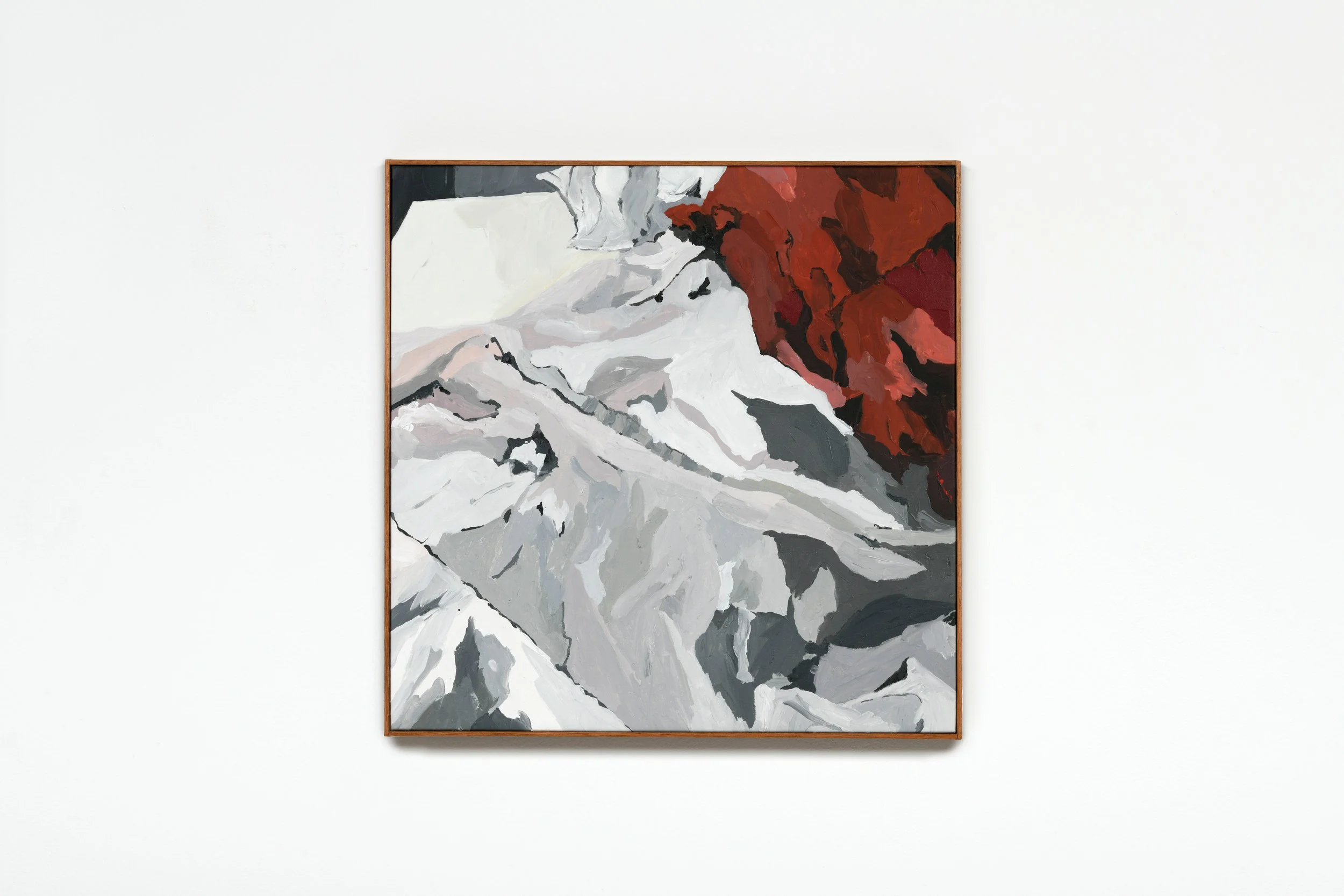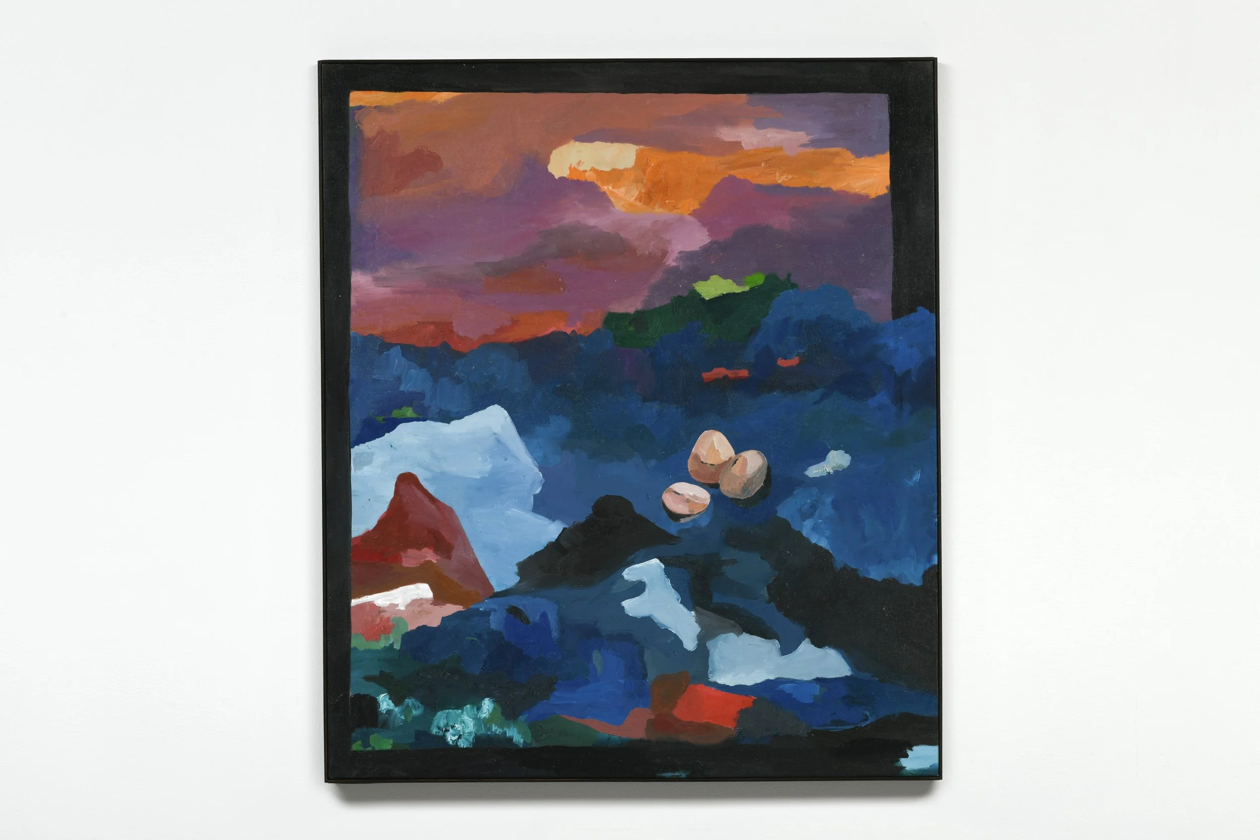 Paisagem é um conceito utilizado para designar um fragmento do espaço geográfico que pode ser identificado e interpretado por meio de nossos sentidos. Ela é alterada de acordo com aquele que olha para o espaço e pela sobreposição de tempos nele contida. Nesta seleção de trabalhos de Paloma Mecozzi, a artista traz à tona a ambiguidade e a impossibilidade de separar a paisagem interna e externa. O sujeito que olha e recorta o fragmento do mundo é o mesmo que o retrata na pintura. O lugar mais íntimo, a cama, confunde-se com os mares de morros, e, em uma cadeia rochosa, nós identificamos algo que se parece com um ovo. A escala garante este jogo entre interno e externo: não há um referente objetivo, mas uma tentativa de transformar a pintura em um espaço absoluto, ou em um mundo em si mesmo.