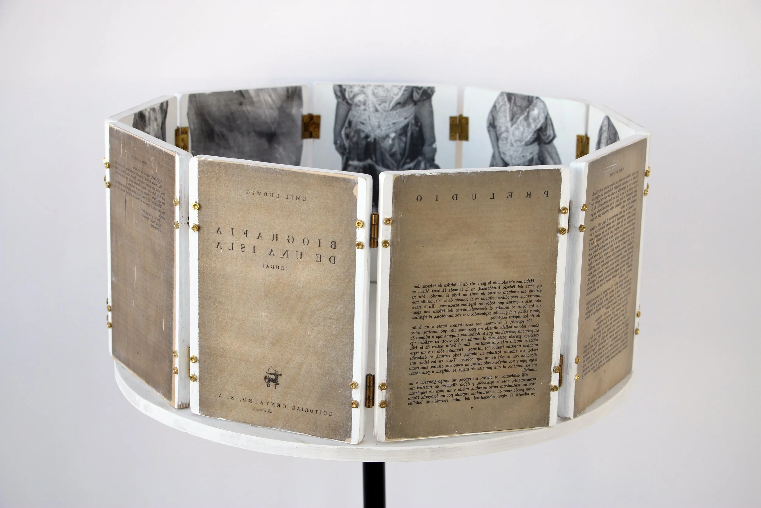 “Cuba tem uma relação ambígua com a arte e as leituras, tudo o que é publicado é financiado pelo Estado, uma benção, mas também uma forma de controle. As publicações não são, portanto, tão abundantes e não é incomum encontrar umas muito antigas e bem cuidadas. Nas caminhadas por Miramar, encontrei Biografía de una isla, na varanda de uma casa-livraria. O prefácio do livro é sobre um homem indígena que acorda depois de 500 anos na vitrine de um museu no centro de Havana e começa a analisar as mudanças desde o colonialismo. É uma ficção especulativa que termina com a frase ‘Y desapareció’. Transferi as páginas deste prefácio e continuei a história adicionando imagens da santera Raiza, que visitei muitas vezes em sua casa no subúrbio da cidade de Havana. Ela veste o traje de gala, que só é permitido usar em duas ocasiões: no renascimento (na iniciação à Santería) e na morte. Mas ela queria tanto me mostrar como era lindo que ela acabou pedindo à vizinha o traje dela emprestado e botou para eu ver. Então dançou até desaparecer.” – Ana Hupe