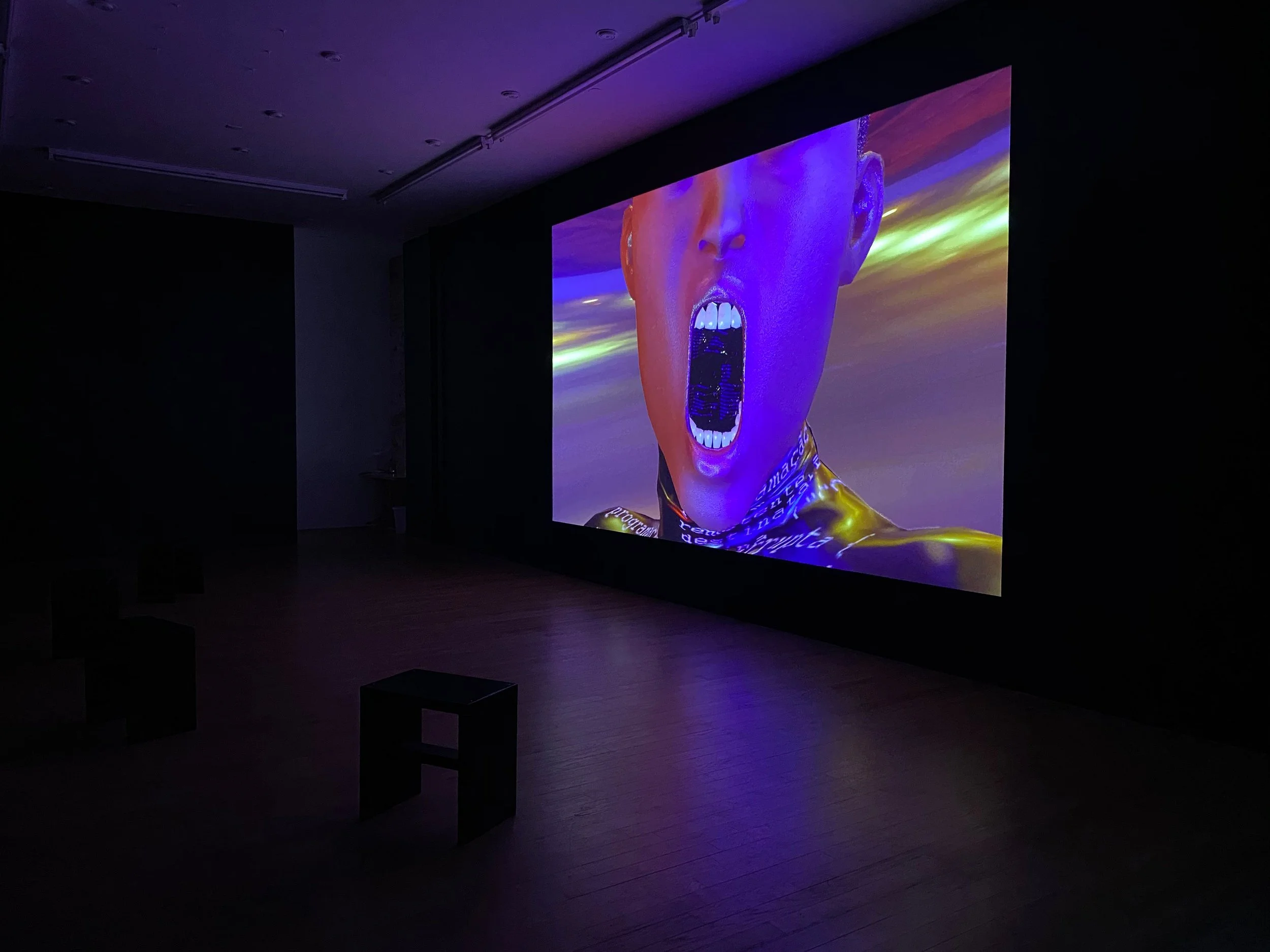 Vitória Cribb, Observer_, 2022, instalação site-specific, video 2 canais, animação CGI, looping video, The Silence of Tired Tongues, Framer Framed, Amsterdam, 2022 - Foto: © Maarten Nauw / Framer Framed.